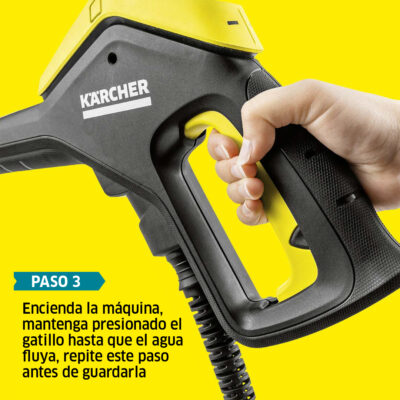 3. Descompresión: una vez terminado el uso de la hidrolavadora, apagar el producto (estado OFF) y también cerrar el suministro del agua, posteriormente accionar la pistola en la cual nos daremos cuenta que liberará la presión almacenada en la bomba y todo el mecanismo interno evitando el daño a futuro en válvulas y ruptura de los demás componentes a causa de la presión.