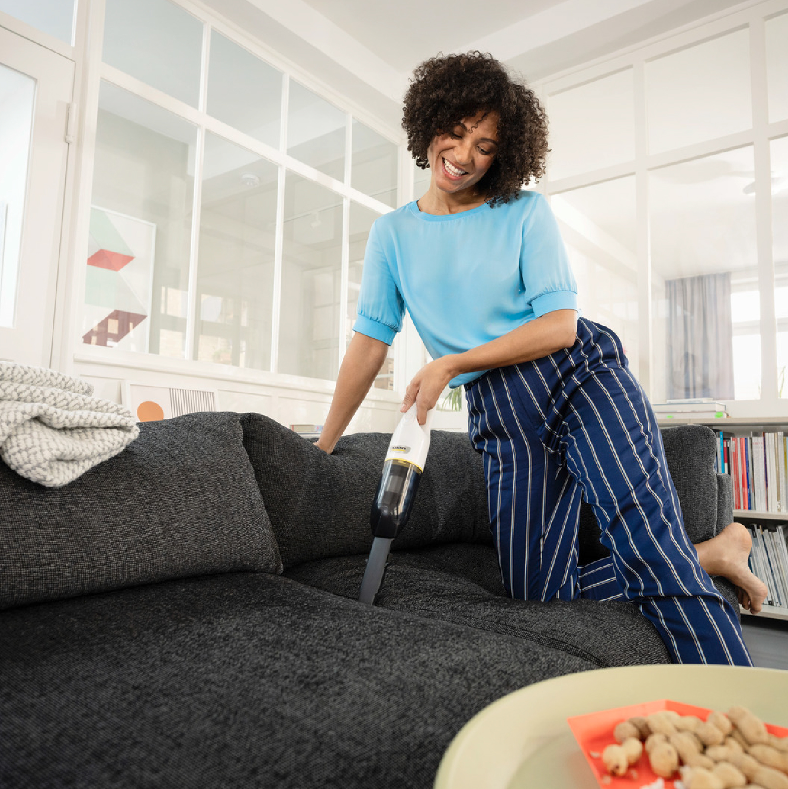 La aspiradora CVH 2 de mano ayuda eliminar los residuos secos fácilmente, como, las migajas, el polvo y el cabello sobre los muebles, el suelo y en vehículos. Gracias al diseño compacto y ligero, la aspiradora también es fácil de manejar y almacenar. El sistema de filtro de dos posiciones de regulación de red de acero fina para suciedad gruesa y cabellos se puede lavar y proporciona un aire de salida especialmente limpio, al igual que el filtro higiénico HEPA 12 situado detrás.