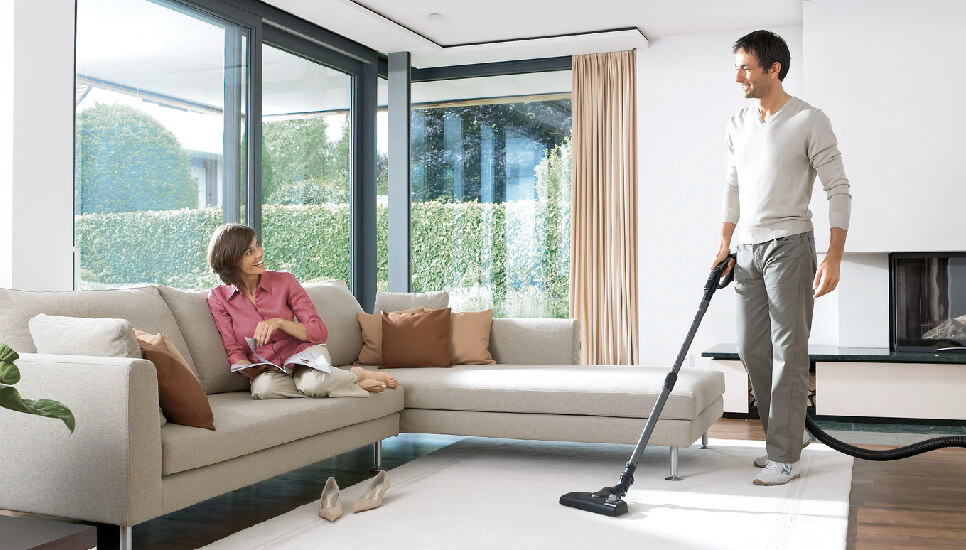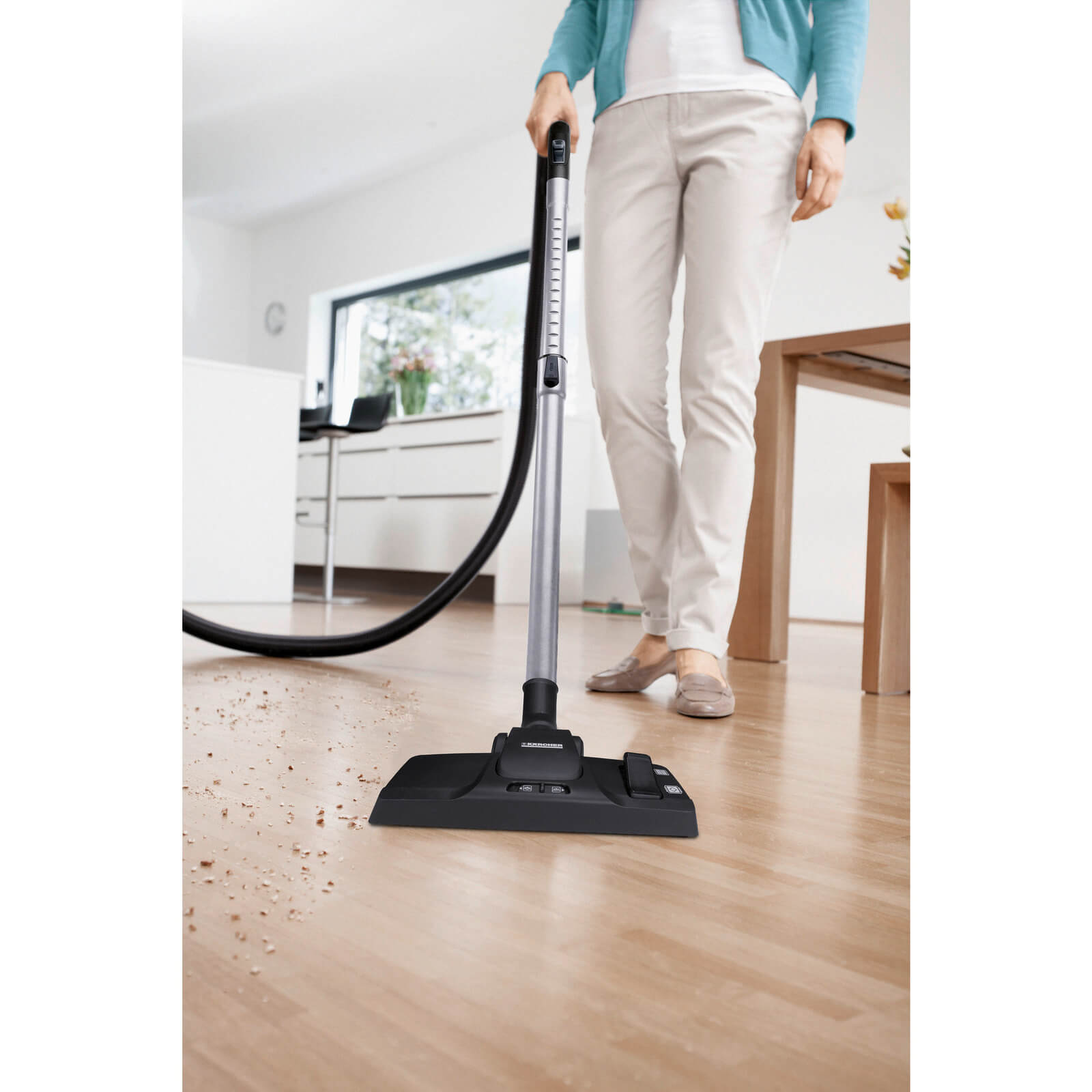 Aspiradora eficaz y ecológica limpia suelos y alfombras sin esfuerzo. Además puede usarse en zonas estrechas, esquinas, bordes y otros puntos de difícil acceso. Su cómodo sistema de bolsas de filtro simplifica la eliminación de bolsas enteras, y gracias al práctico almacenaje de accesorios, siempre impera el orden. De diseño elegante y de prácticas dimensiones, la aspiradora resulta perfecta para los hogares modernos. Este equipo ideal para familias ofrece también un filtro Hepa que absorbe el 90 % del polvo y las partículas y mantiene el aire limpio incluso durante la aspiración.