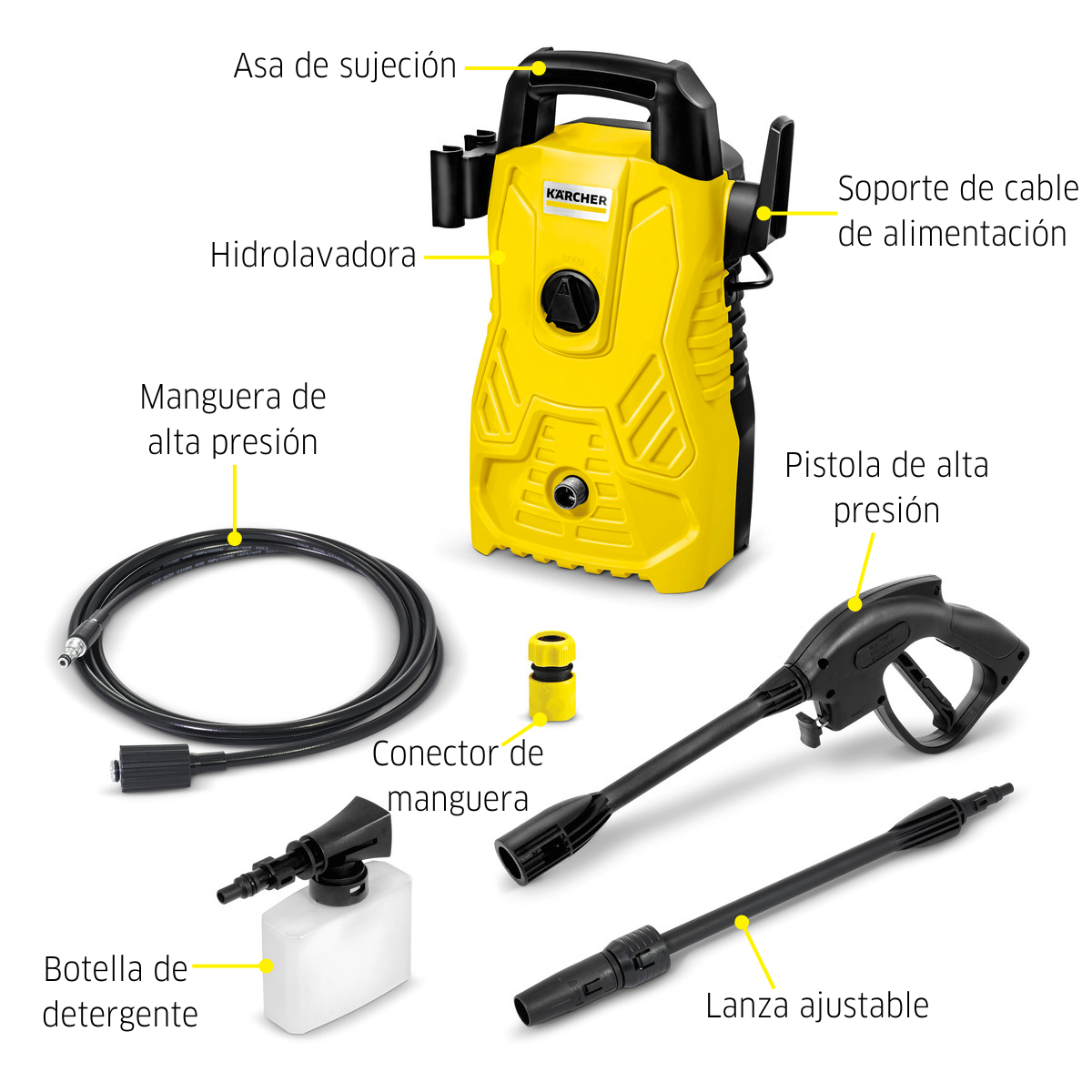| Peso sin accesorios (kg) | Hidrolavadora, Lanza Vario Power, Manguera de alta presión, aplicador de detergentes, Gatillo de alta presión |