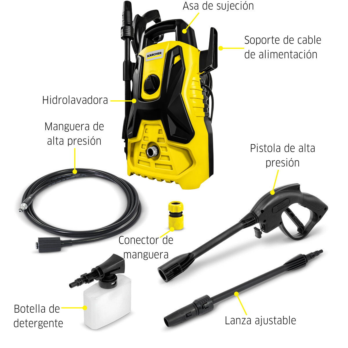 | Peso sin accesorios (kg) | – 1 lanza de chorro recto ajustable ideal para la limpieza diaria – 1 pistola de alta presión – 1 Manguera de alta presión de 3 metros – 1 cañón de espuma (300ml) |