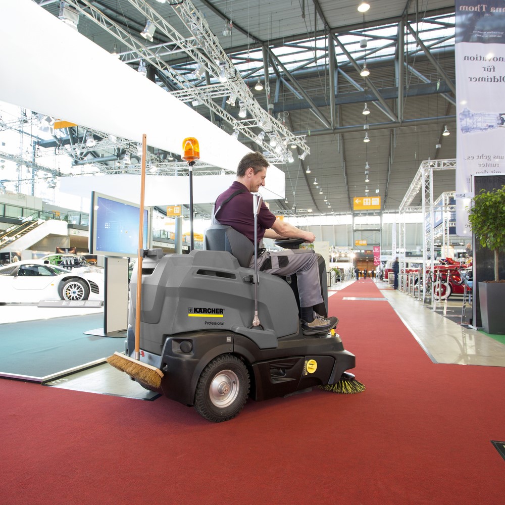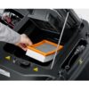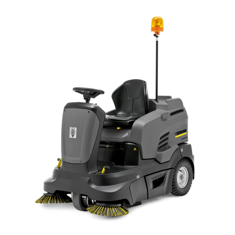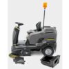 Barredora con conductor sentado KM 90/60 R Bp Pack Adv —robusta, compacta, manejable y sin emisiones— con sistema de limpieza de filtros Tact, estación base, Easy Operation y práctica superficie de carga.